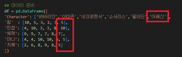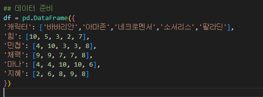 df = pd.DataFrame(data, columns=['Character','힘','민첩','체력','마나','지혜'] )