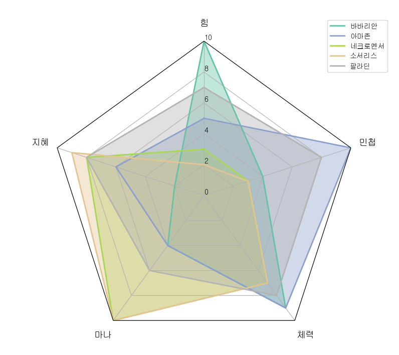 안녕하세요~ 꽁냥이에요. 보통 게임 속 캐릭터의 능력치를 나타낼 때 레이더 차트(Radar chart)를 많이 사용합니다. 여러분들도 많이 보셨을 거예요. 레이더 차트는 스파이더 차트(Spider chart)라고도